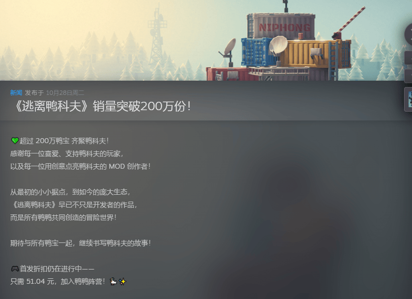 【1】由B站发行的鸭子题材PVE俯视角搜打撤单机游戏《逃离鸭科夫》的热度仍在持续攀升。10月28日,官方宣布游戏销量已达到200万份——此时距离其销量达到100万份仅过去6天。截至本周,该作Steam评论总数已超过3.6万条,且近三分之一来自非国区,好评率96%。同时,其玩家在线峰值也突破30万,并稳居Steam热玩榜前5。