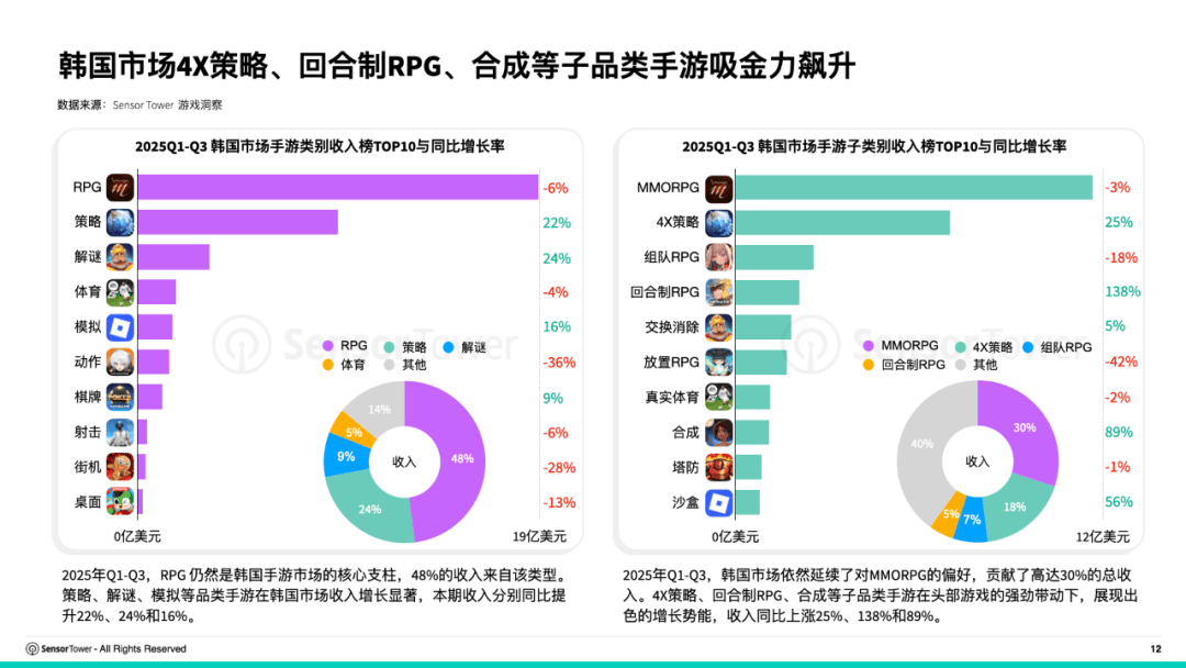 同时报告还指出,RPG仍是韩国手游市场的核心支柱,2025年前三季度贡献了48%的总收入,其中高达30%的总收入来自MMORPG。4X策略、回合制RPG与合成等子品类手游在头部游戏的强劲带动下,收入同比上涨25%、138%和89%,展现出色的增长势能。