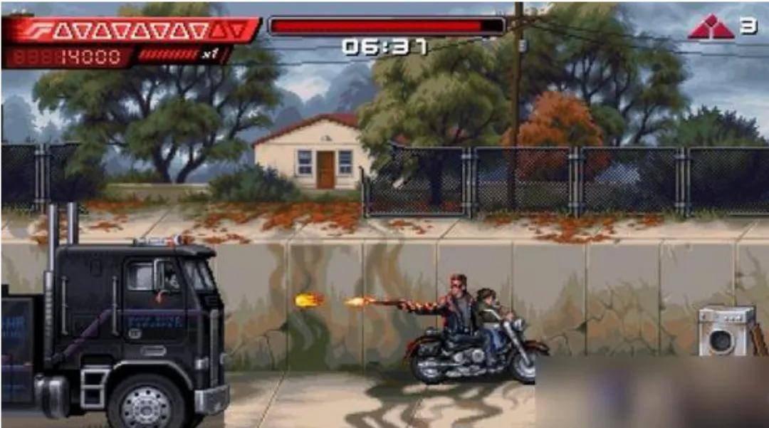 没错,这是一款《终结者2》背景的横板像素射击游戏,我们操作T800和莎拉以及康纳,一边努力逃脱追杀,一边改变历史。