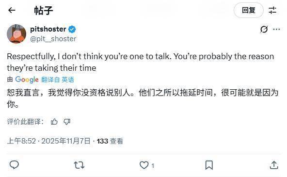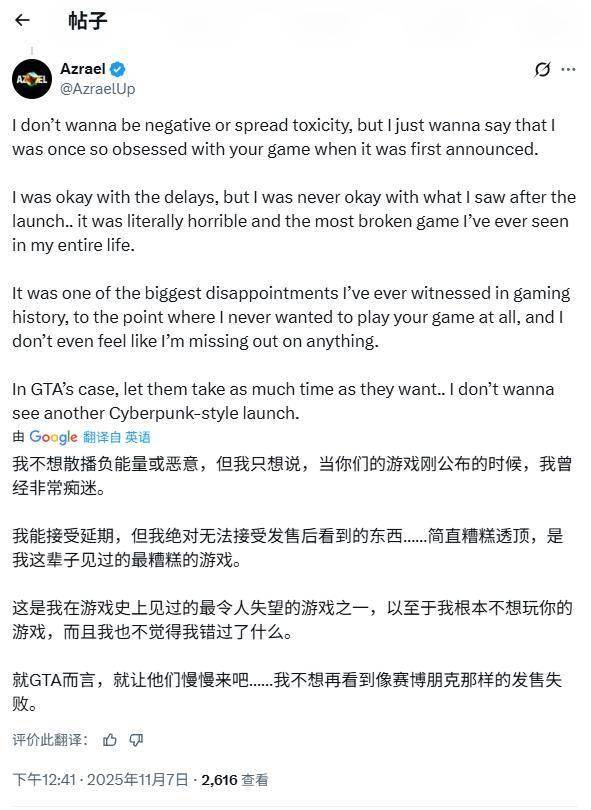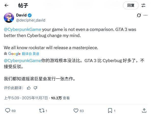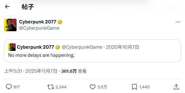在《GTA6》再次延期之后,《赛博朋克2077》的开发团队在社交平台X的官方帖子下发表评论,引用了自己2020年的一条推文——当时他们承诺“不会再有延期”。这一举动显然是在影射Take-Two首席执行官Strauss Zelnick此前的言论,他曾保证《GTA6》一定会在2026年5月26日发布。