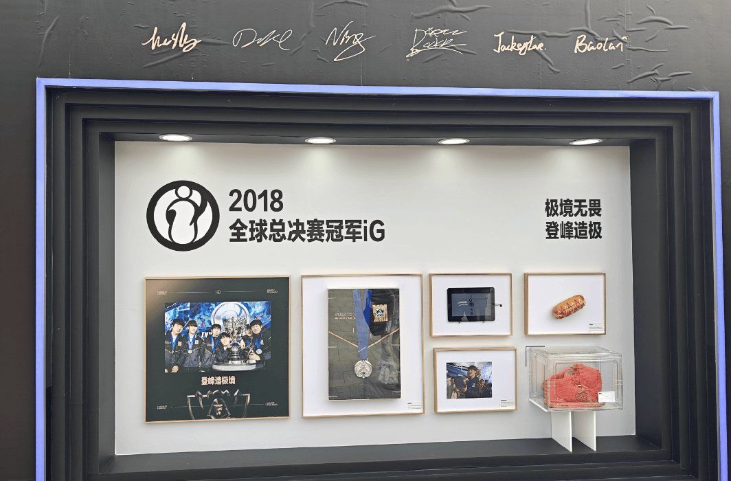 iG战队的展区定格了2018年的传奇时刻:不仅是那座象征巅峰的冠军奖牌,还有王校长在釜山现场吃热狗的趣味画面,以及JackeyLove扛着奖杯走向采访区的经典照片。每一件展品,都承载着一代玩家的共同记忆。