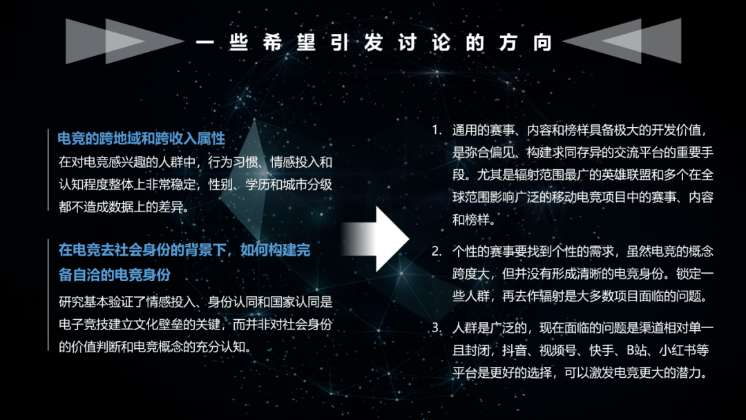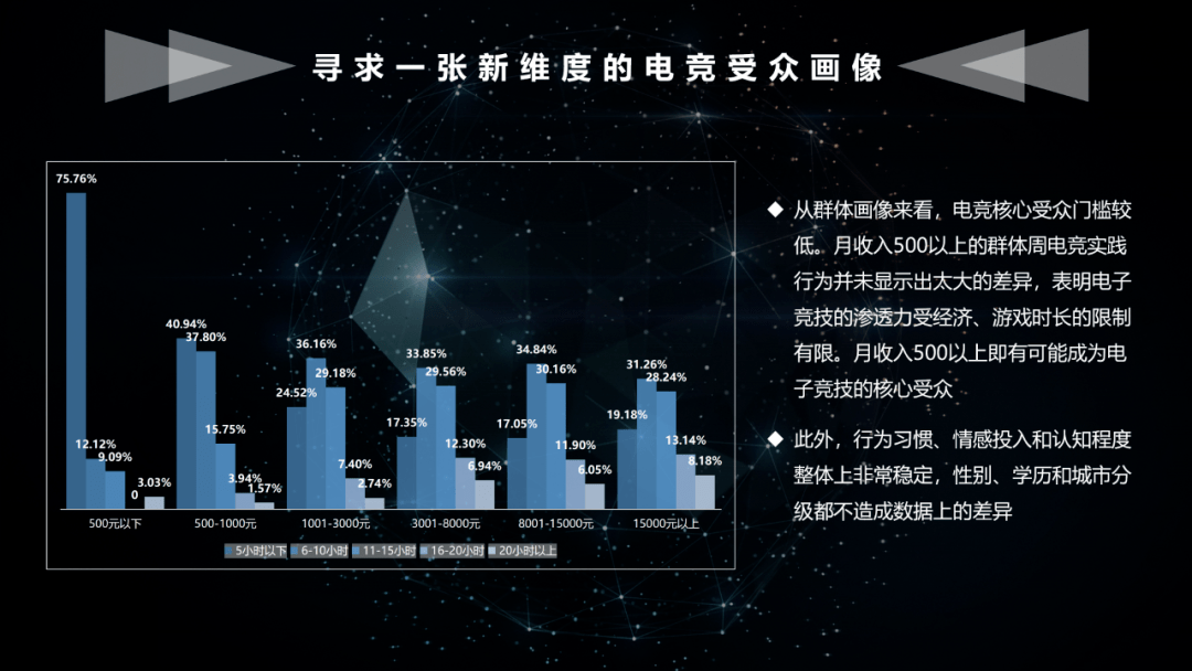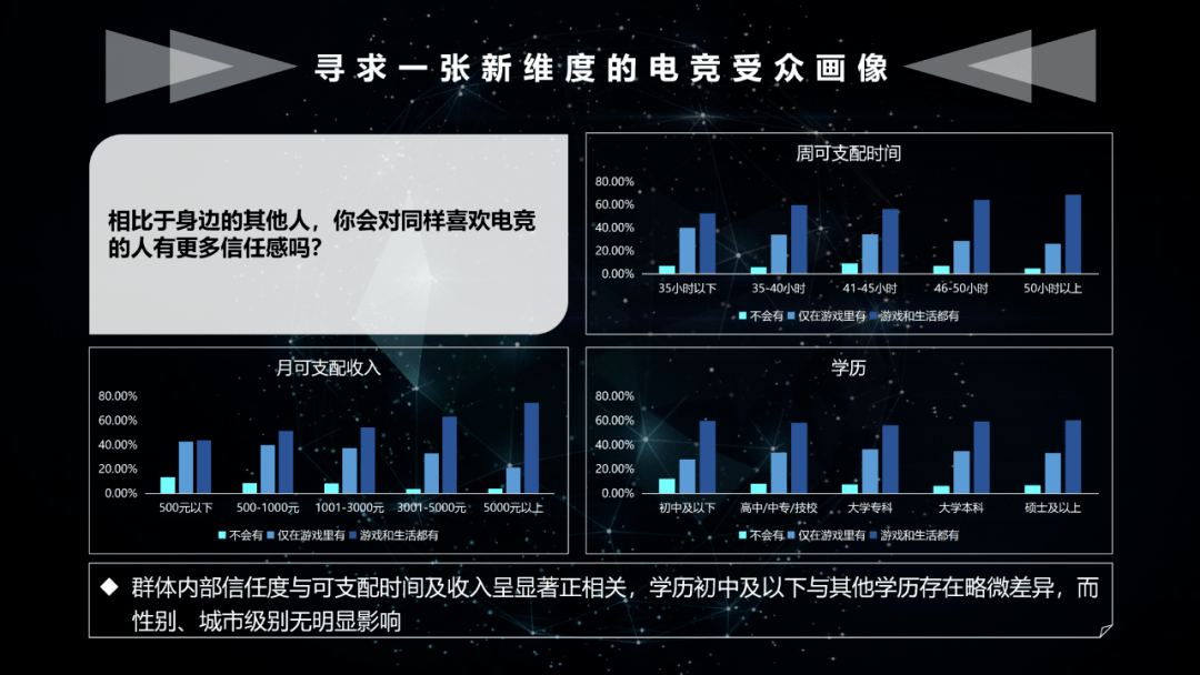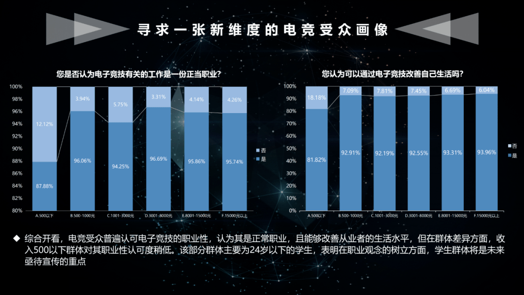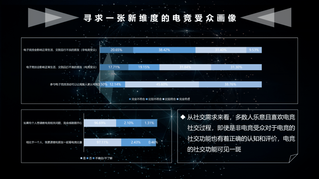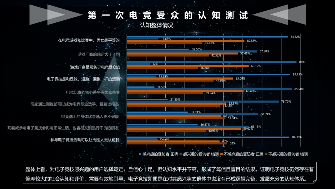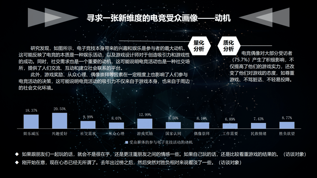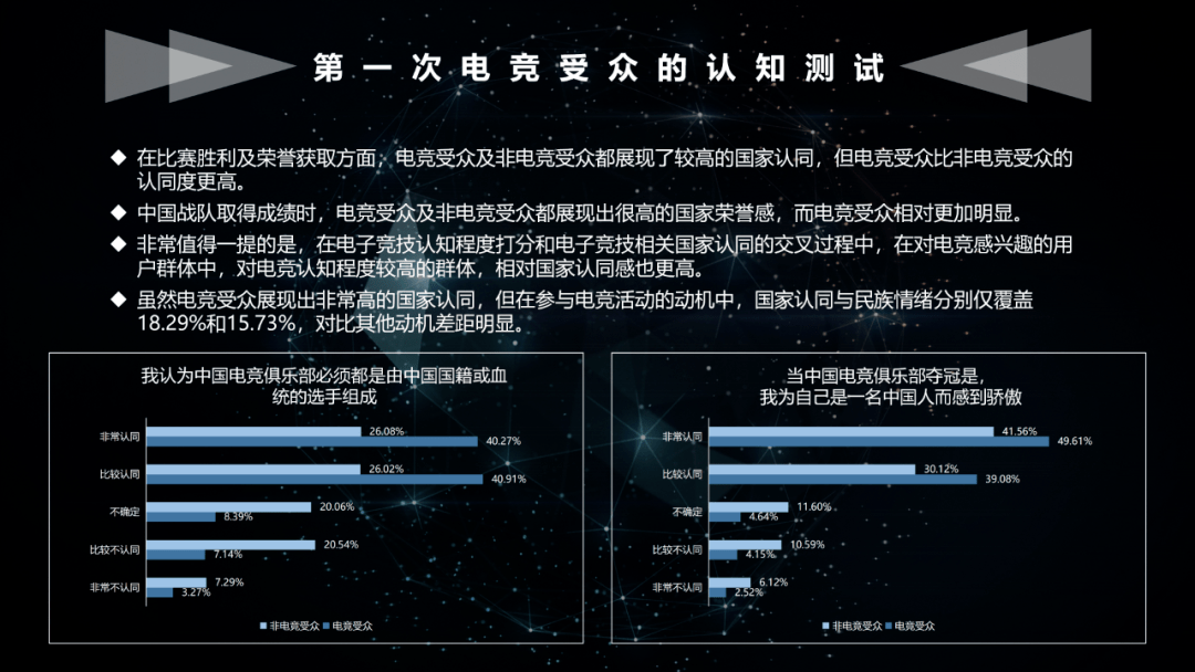 《中国电子竞技受众情感和认知样貌》报告是由浙江大学传媒与国际文化学院赵瑜佩老师团队、《电子竞技》杂志编辑部共同参与的课题研究,旨在找到基础的观赛、消费等行为与更深层次的认知程度和情感投入之间的关联,同时验证在不同区位之间电子竞技是否具有打破地域限制的特殊属性。通过对万余份线上问卷的投放,以及38位电子竞技受众超过100小时的深度采访,我们发现电竞在不同城市、性别、收入条件下,确实具有其他文化体育活动不具备的破圈效应。此外,受众对电竞概念的认知不成熟,以及在电竞活动中体现出的强烈且盲目的民族情绪是需要持续关注和引导的。