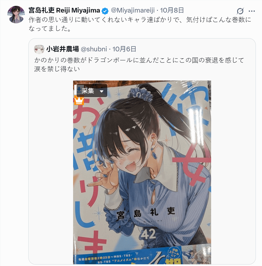 宫岛礼吏本人也在粉丝抱怨连载之长时亲自转推吐槽。