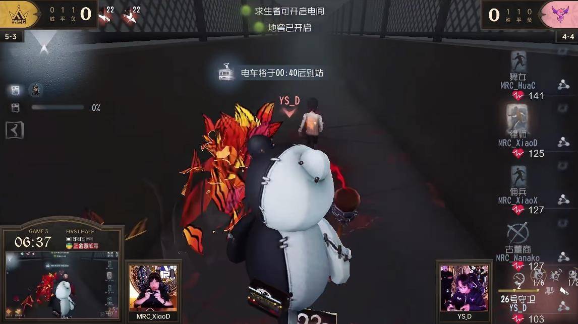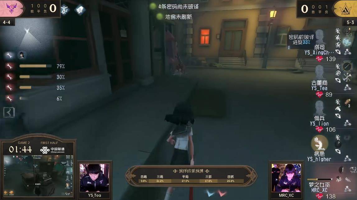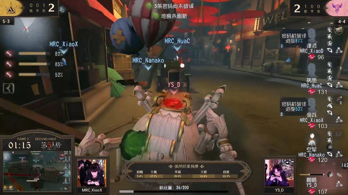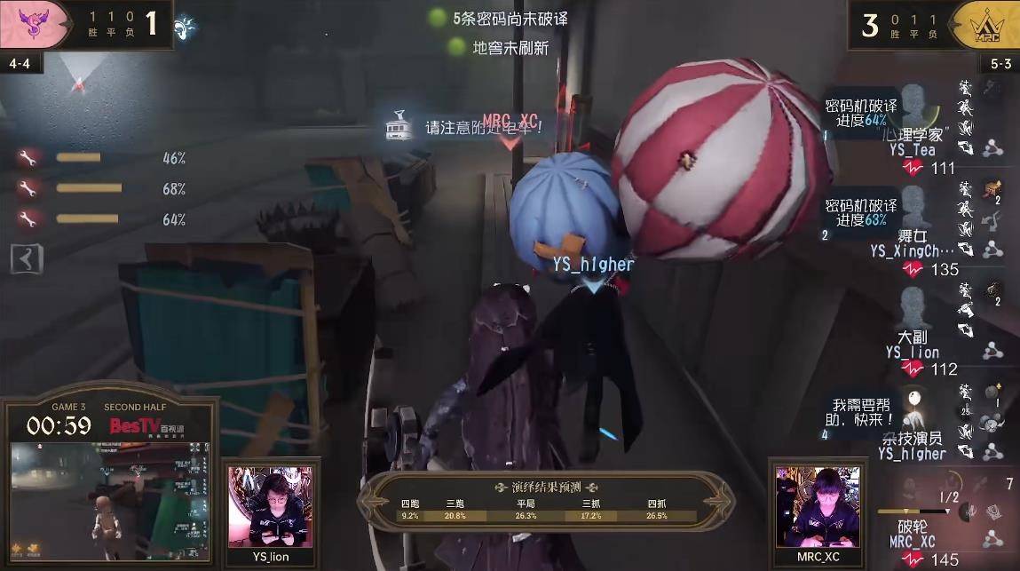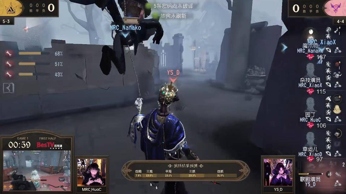 第二局比赛MRC战队和YS战队以4:4战平,第三局比赛地图为永眠镇,这张地图是求生者偏优势图。