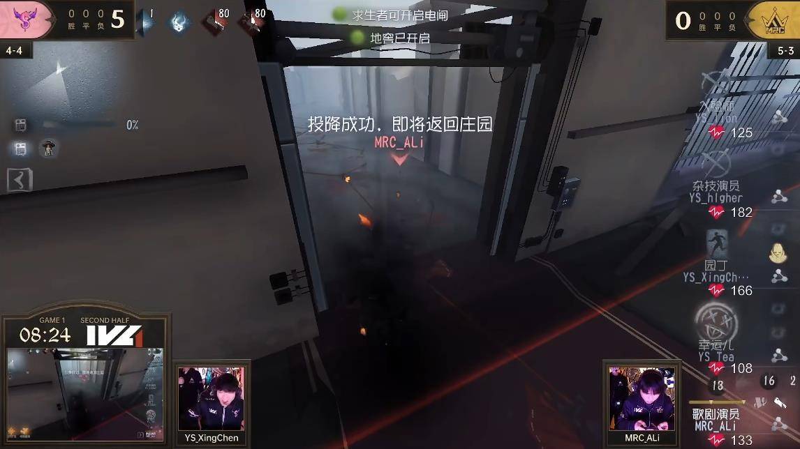 第一局比赛YS战队以6:3的优势领先MRC战队。上半轮监管者追击魔术师被击倒并上椅。园丁扛刀救下。淘汰魔术师后淘汰幸运儿,击倒园丁后再次击倒杂技演员。最终监管者4抓获胜。下半轮监管者追击杂技演员将其击倒并上椅,园丁无伤救下。淘汰杂技演员后淘汰入殓师,击倒幸运儿,园丁成功出门,最终监管者3抓获胜。