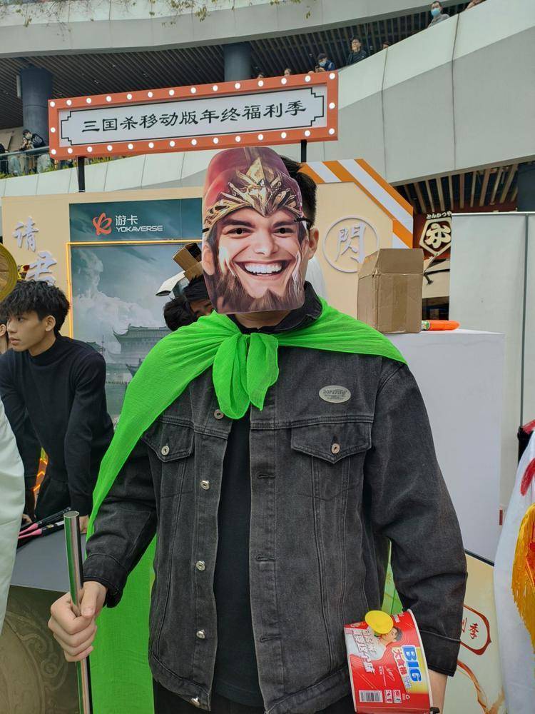 In a creative display of cosplay, Mr. Zhang, an experienced player who has worked in a Shenzhen-based internet company for many years, delighted fellow gamers by donning a hat made from a clean noodle bowl, a cloak fashioned from green fabric, and a character mask to complete the look of "徐盛" (Xu Sheng). Having been part of the Killers of the Three Kingdoms tabletop game community since its early days in 2009, Mr. Zhang eagerly prepared this distinctive attire upon learning about the COS contest in Shenzhen. Explaining his choice, he shared, "I believe what everyone needs the most in today's society and workplace is the cheerful demeanor of Xu Sheng. That's why I specifically chose to portray this 'Sunny and Cheerful Young Man' to spread joy and happiness among everyone." As he made his entrance, the crowd erupted in cheers, appreciating both the creativity and positive energy brought to life through his portrayal of the character.