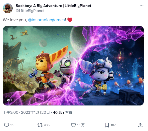 同为索尼旗下的《小小大星球》开发团队Sackboy,贡献了一张按他们游戏的风格绘制的《瑞奇与叮当》艺术图,为Insomniac加油。