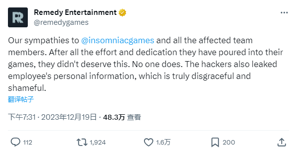 《心灵杀手》开发商Remedy也发布声援推文,对Insomniac所有受影响的员工表示同情。“在他们将所有的努力和奉献投入到游戏中之后,他们不应该得到这样的结果。……黑客还泄露了员工的个人信息,这实在是既不光彩又可耻。”