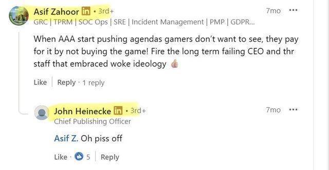 七个月前,曾有玩家抱怨现在的西方游戏开发商总喜欢一股脑地在其游戏中强加他们的政治意识形态,而玩家们通过选择不买作为回应。呼吁解雇这些拥抱woke意识形态的CEO和开发者。对此John Heinecke回应说:“滚开”。