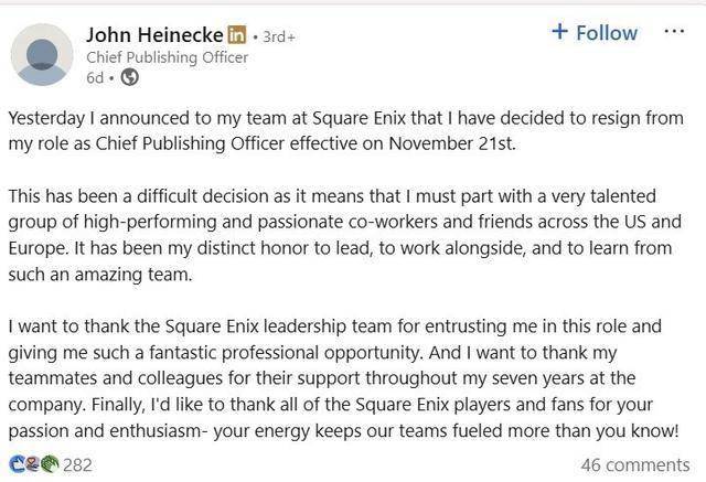 近期日本游戏大厂SquareEnix在欧美启动了大裁员,在这一波裁员中曾经骂玩家“滚开”负责SE西方分部发行的总经理约翰·海内克(John Heinecke)也将于11月21日辞职。