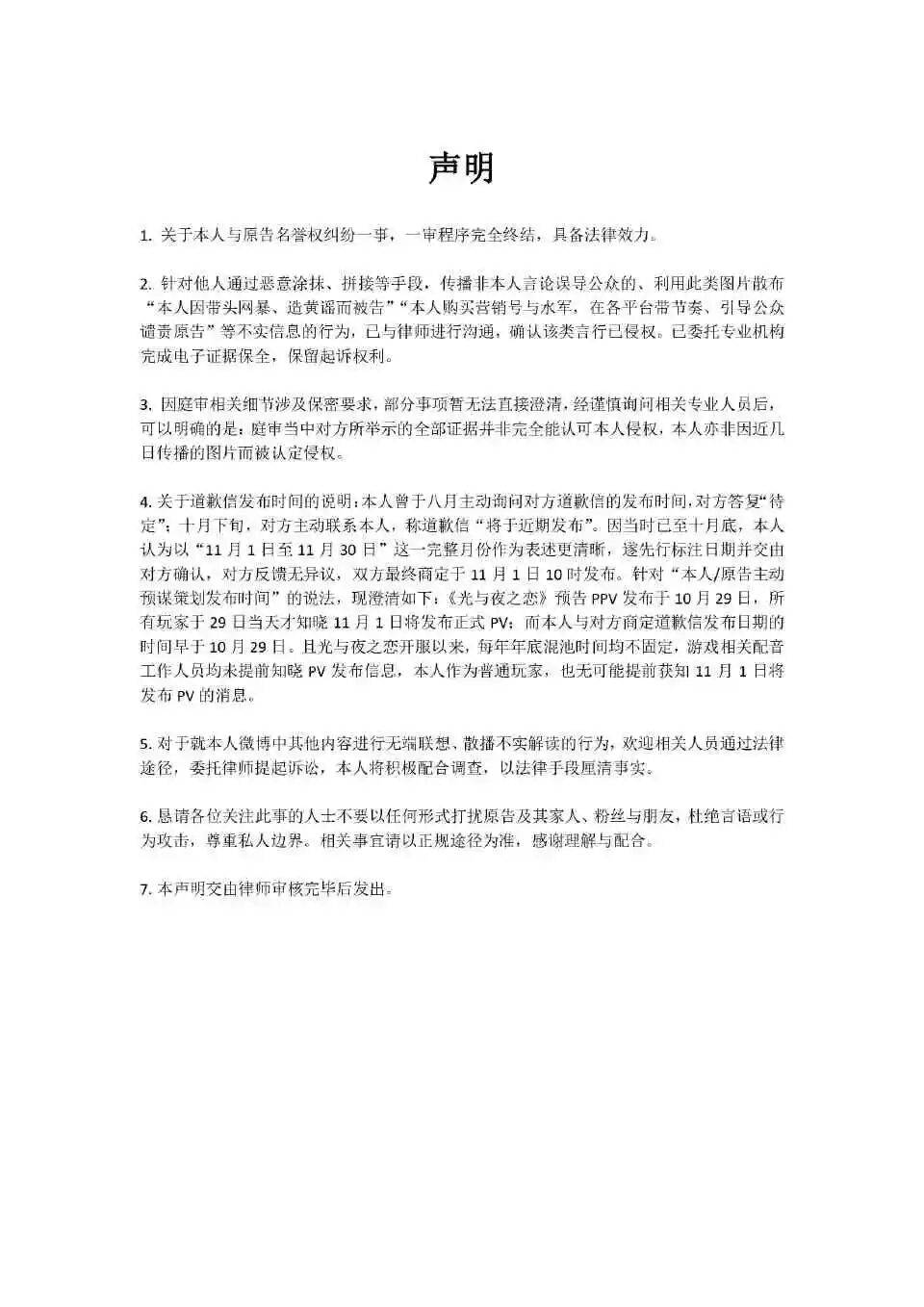 11月4日,写道歉信的玩家再次发布图片,这次是一则声明,针对其他玩家或者声优粉丝认为她故意在11月1日(游戏官方发布PV)发道歉信带节奏蹭热度的言论。