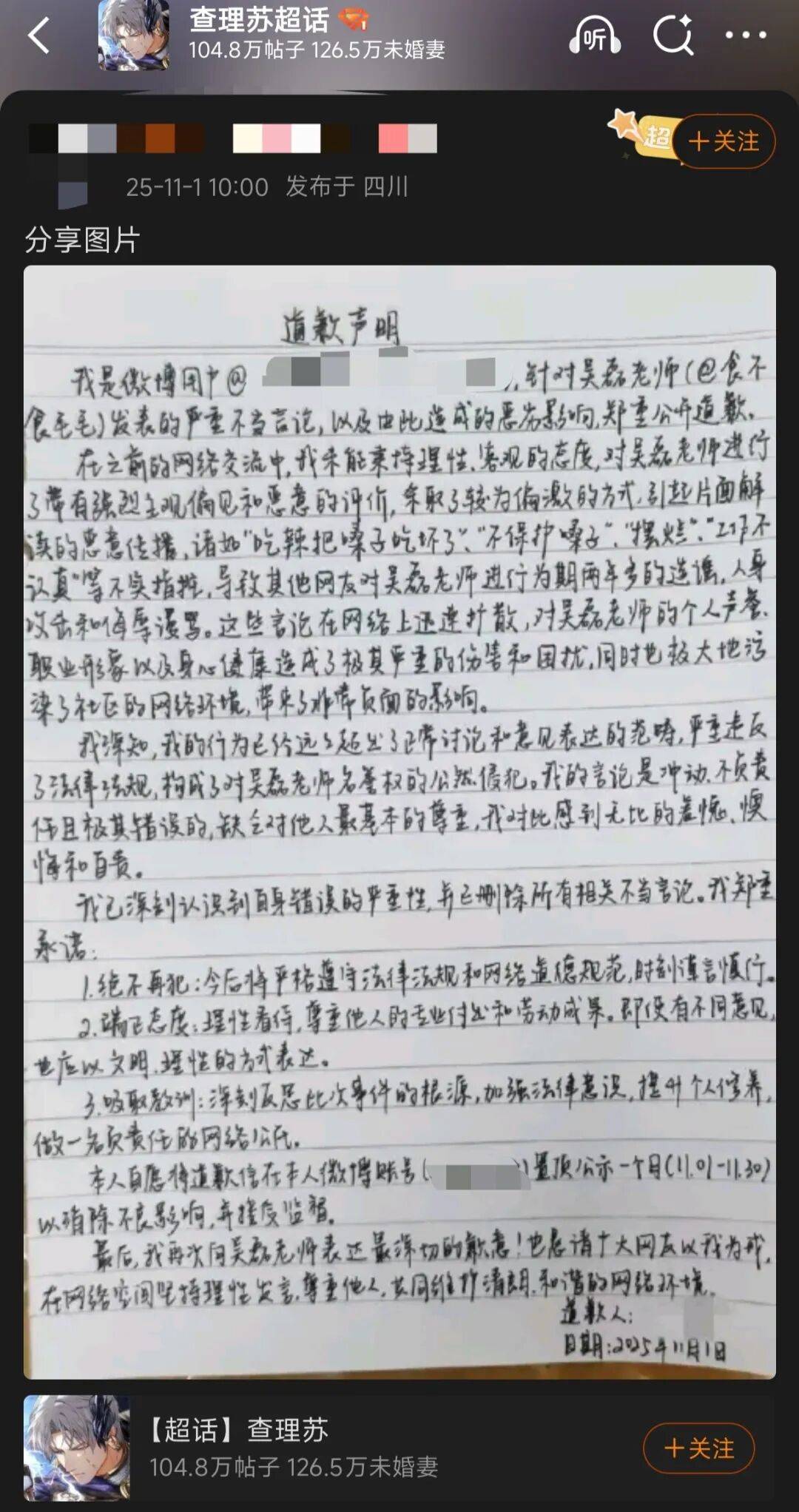 事先声明,姬只给玩家的微博ID和手写信里的ID打码了,并没有给道歉人打码。