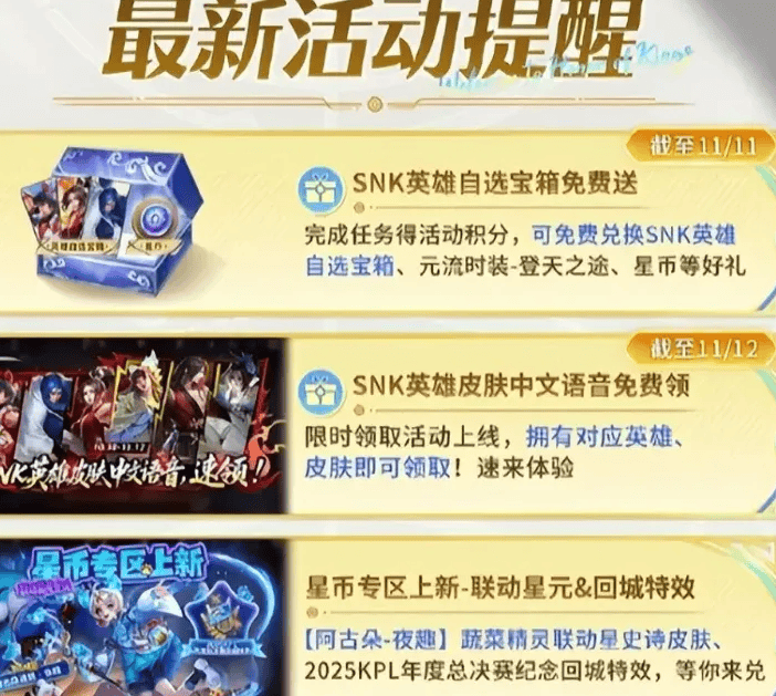 最后再分享一波王者的福利,为了配合年总决赛的到来,这波福利也是直接拉满了,特别是喜欢SNK英雄的玩家,不容错过。比如SNK英雄自选宝箱免费送,登录游戏获得活动积分,就可以了,任务很简单,还有元流时装、星币等好礼。还有SNK中文语音免费领,蔬菜精灵联动星史诗皮肤,总决赛纪念回城特效,明星选手的趣味语音等,另外,决赛当天,还有冠军纪念头像框,只要和本命英雄一起完成鸟巢合影即可。快去感受吧。