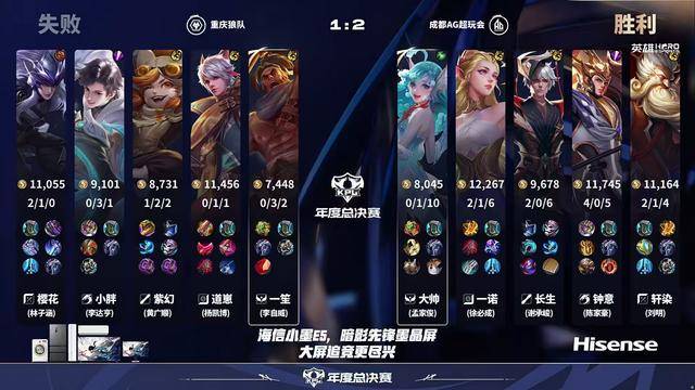 最后一波狼队殊死一搏,一笙想闪现咬个脆皮,但只能咬到蒙恬,甚至还没能换掉轩染。一诺点死东皇,交闪现追点老虎。火舞二闪接大换掉道崽。一诺一波三杀收尾,AG直推水晶拿下比赛。