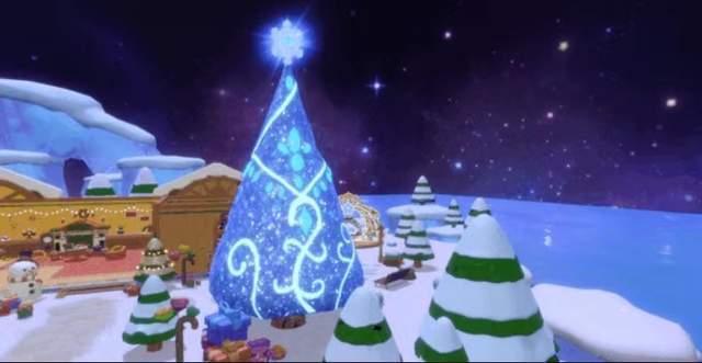 星光熠熠,雾凇飘落。肆意蔓延的彩灯和梦幻迷人的漫天星光,衬得圣诞树好似冬日夜空中翩翩起舞的蓝色精灵,它散发出的神秘的光芒也让蛋仔们忍不住沉浸其中。圣诞树下还摆放着一堆包裹着各式各样的彩纸和蝴蝶结的精美礼物,不知道里面会不会有让蛋仔们意想不到的惊喜?