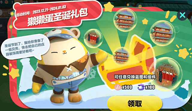 岁寒暖人心,礼包传情意,獭獭蛋伴着圣诞礼包穿过风雪而来,只为给大家献上一份温馨的圣诞礼物。蛋仔们只要在2023年12月21日至2024年1月3日的活动期间登录蛋仔庄园,就可免费领取含有100珍珠贝和500贝壳的一次性礼包,玩家们可以用礼包直接免费兑换【国风晴水】蓝图以及所需组件,然后再用这些组件将自己的庄园装扮的美美的,是不是听起来就很心动~