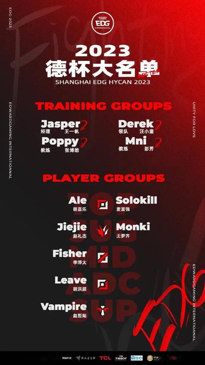 上路双替补Ale与Solokill携手备战,而在打野位置,EDG将依赖Jiejie与Monki的两名打野与队友合作。中单将由Fisher负责,下路则是Leave,而辅助位置则交由Vampire担任。