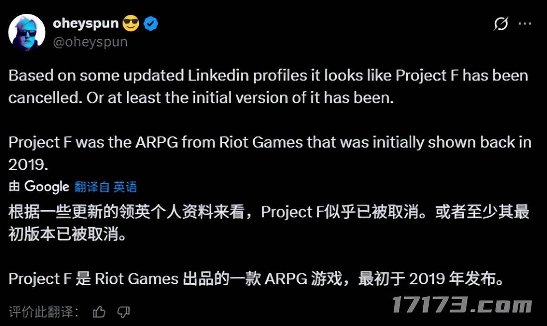 11月5日,博主oheyspun爆料称,根据多位拳头游戏开发人员近期更新的领英资料来看,《英雄联盟》IP旗下的ARPG新作《Project F》似乎已被取消,至少是2019年最初公布的版本已确定终止。