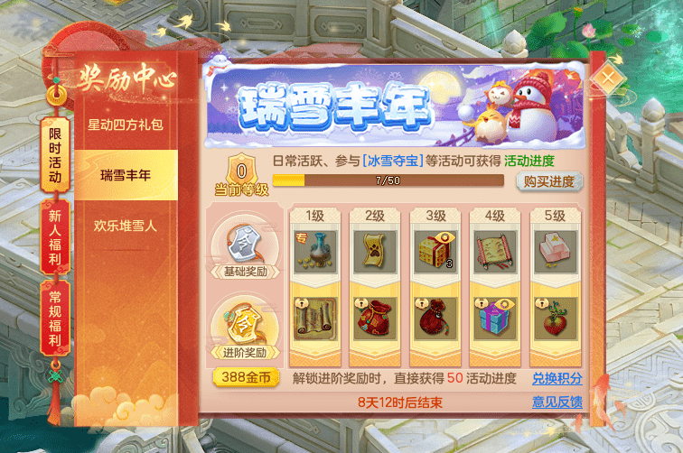 每日登录、活跃或参与冰雪夺宝活动,可获得活动进度。提升活动等级可解锁对应奖励,花费金币可解锁更加丰厚的进阶好礼。
