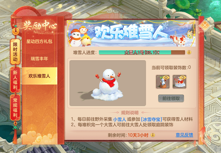 每天9:00-23:00可在野外挑战雪妖,有机会获得堆雪人材料和道具奖励。