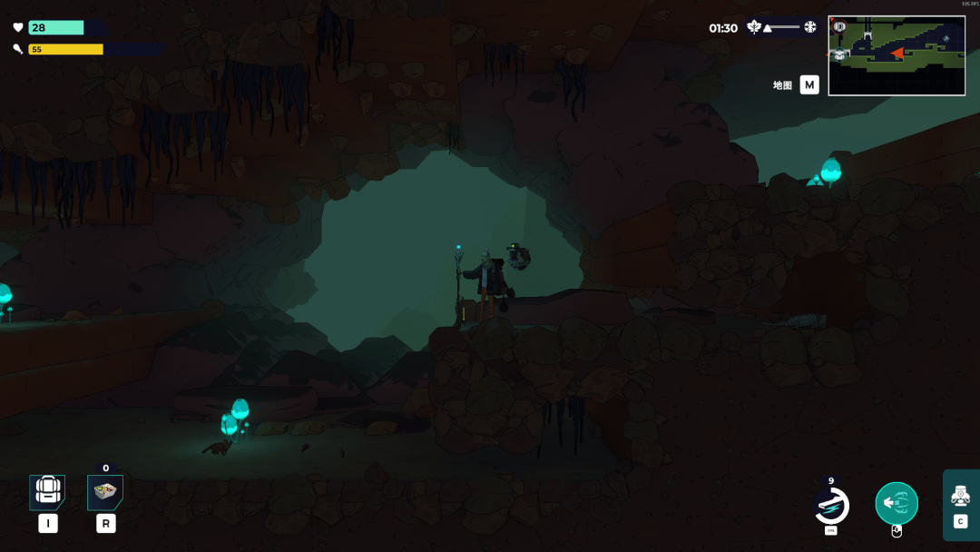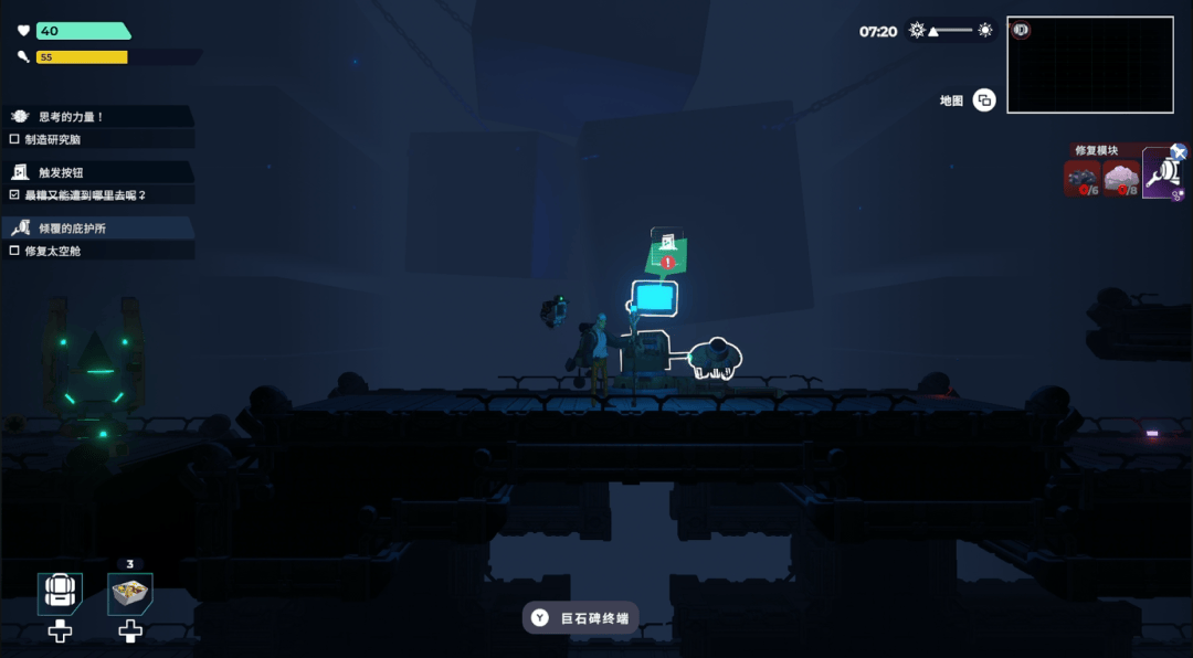 本质上,区域探索是一个双重目标并行的阶段:其一是生存玩法下的资源积累,玩家要沿途收集目之所及的基础资源,以便返回基地后进行建造;其二是类银河城式的信息收集,核心任务是揭开地图的“战争迷雾”,找到重要资源的位置和推进剧情所需的线索。