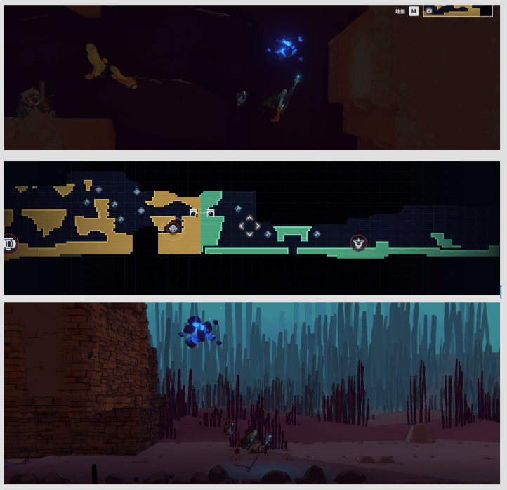 以上三步循环的精髓在于,它将传统类银河城的探索发现(我是否找到了隐藏房间/任务/Boss 来获得关键道具),转变为生存建造(基地的生产力和科技水平是否足够高,得以制作出关键道具),这既保留了沙盒式探索的乐趣,又在微观执行上——即如何破解能力锁层面赋予了玩家类银河城式的结构层级和目标感。