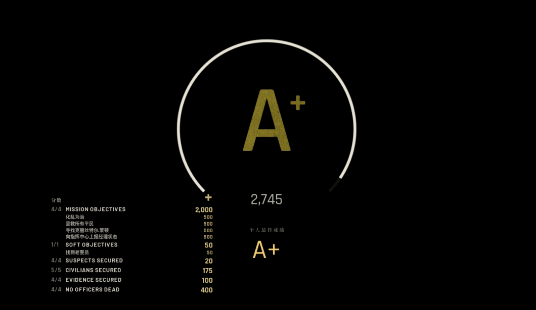 出于调查和引出后续行动考虑,SWAT小队需要寻找地图中可作为证据的线索,还需尽可能动用非致命武力,如胡椒喷雾、电击枪、闪光弹等手段,抓捕重要嫌犯归案。完成的任务要求越多,任务结算分数越高,若是像《合金装备》那样使用非致命武力制服所有坏蛋,就能获得S评价。
