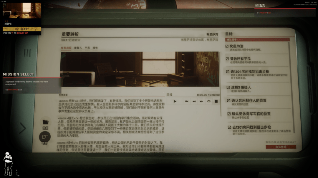 任务材料更是用于渲染背景、烘托气氛的重要一环。还是在校园枪击案任务,简报环节的组长怒不可遏,要求小队装备致命武器进入大楼。在报警电话的三条录音中,前两条的报案人都在打电话的过程中遇难,以至于接第三则电话时,911值班员差点没能控制自己的情绪,哽咽着建议报案人躲藏好。