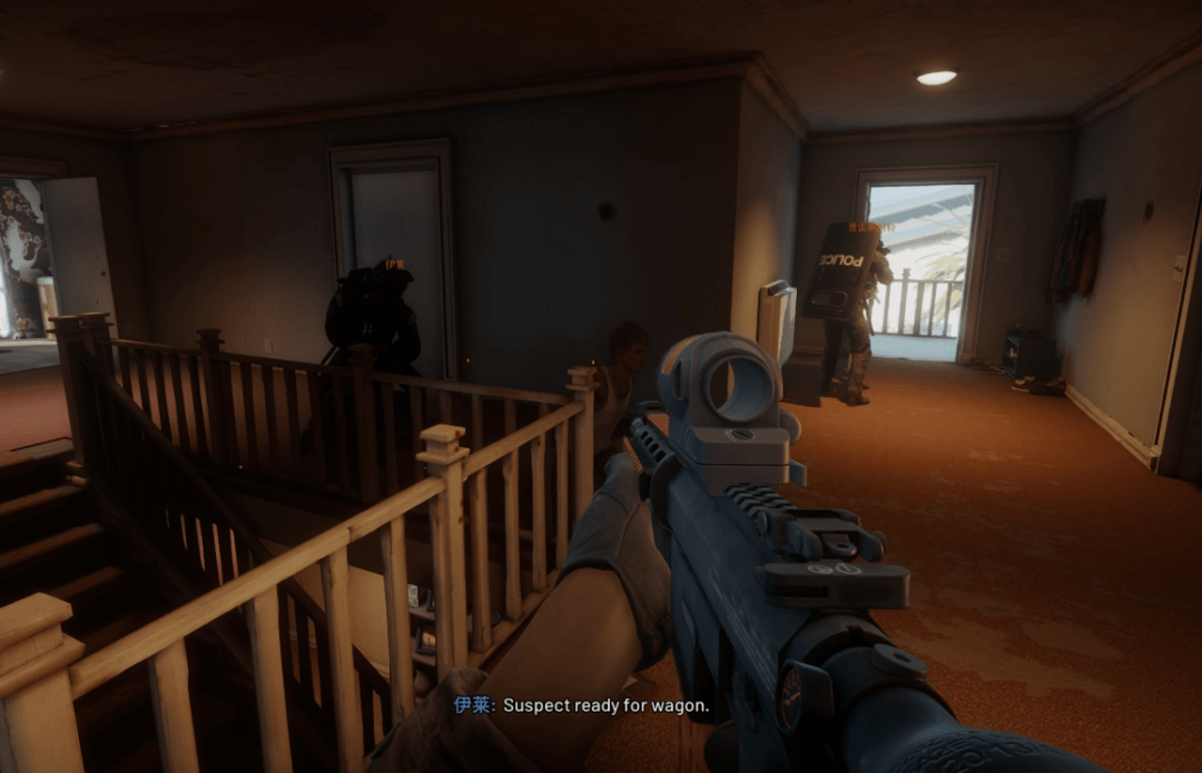 经实战测试,在执行扫荡房间的命令时,队友AI的枪法会比默认的跟随状态更准。AI还知道如何自信收枪,在绝大多数情况下,能够将敌人打到失去能力昏迷而非致死,方便指挥官把任务的逮捕要求糊弄过去。