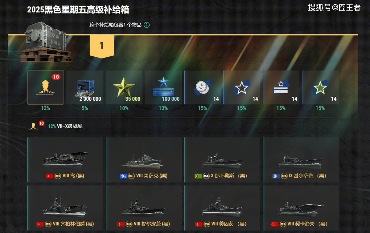 为什么说惊吓?因为《战舰世界》黑五活动的性价比实在高得吓人!拿今年的黑五活动来说吧,黑五补给箱的战舰爆率高达12%,比以往一般箱子的爆率高4、5倍都不止,而且首15抽必出黑五战舰,手气再非,投入15抽就能保底拿船!至于多少级的就看运气了,反正能出就是赚到。