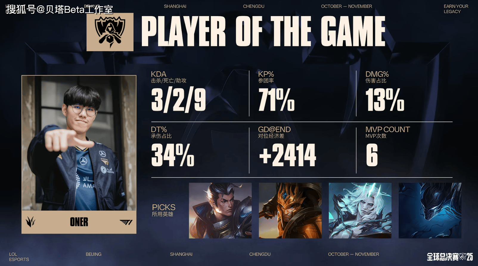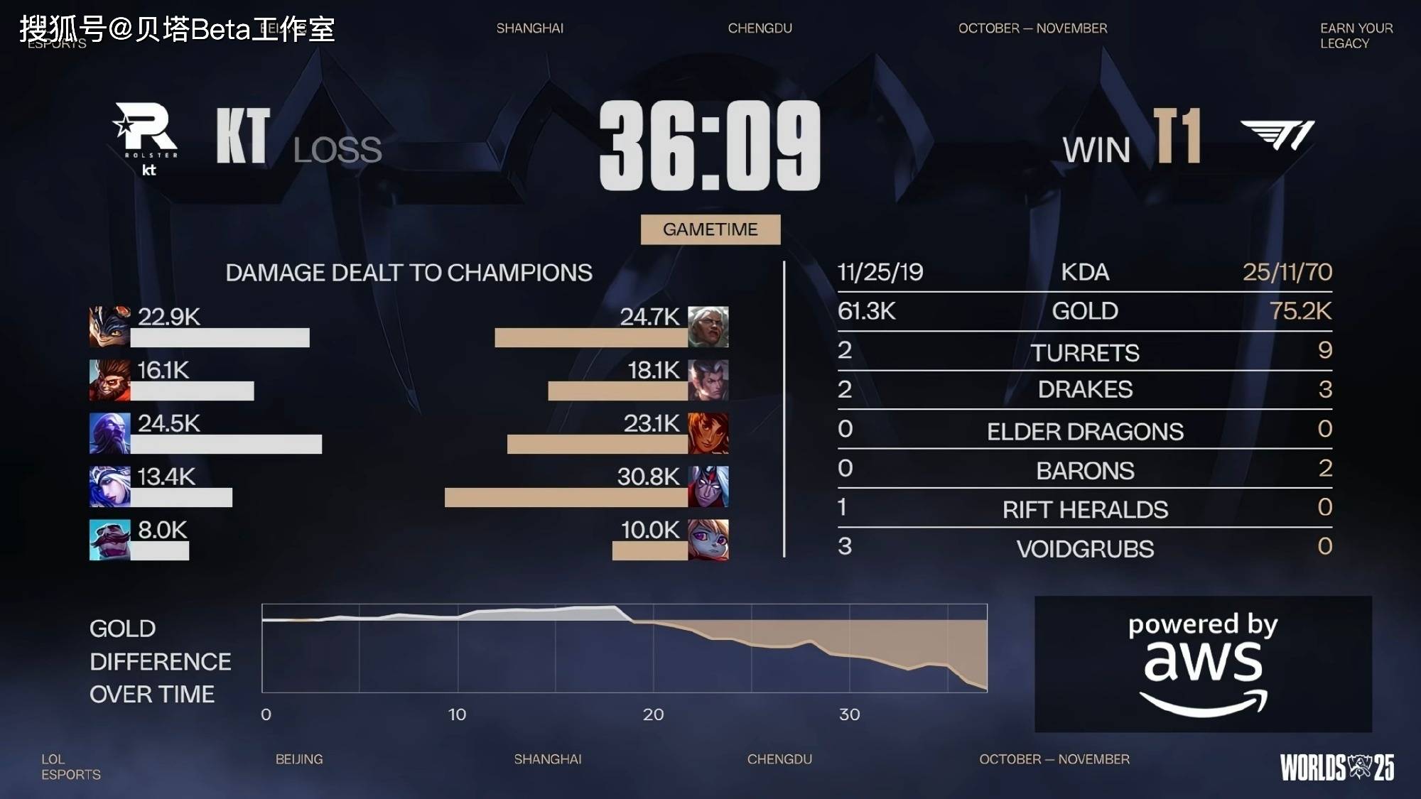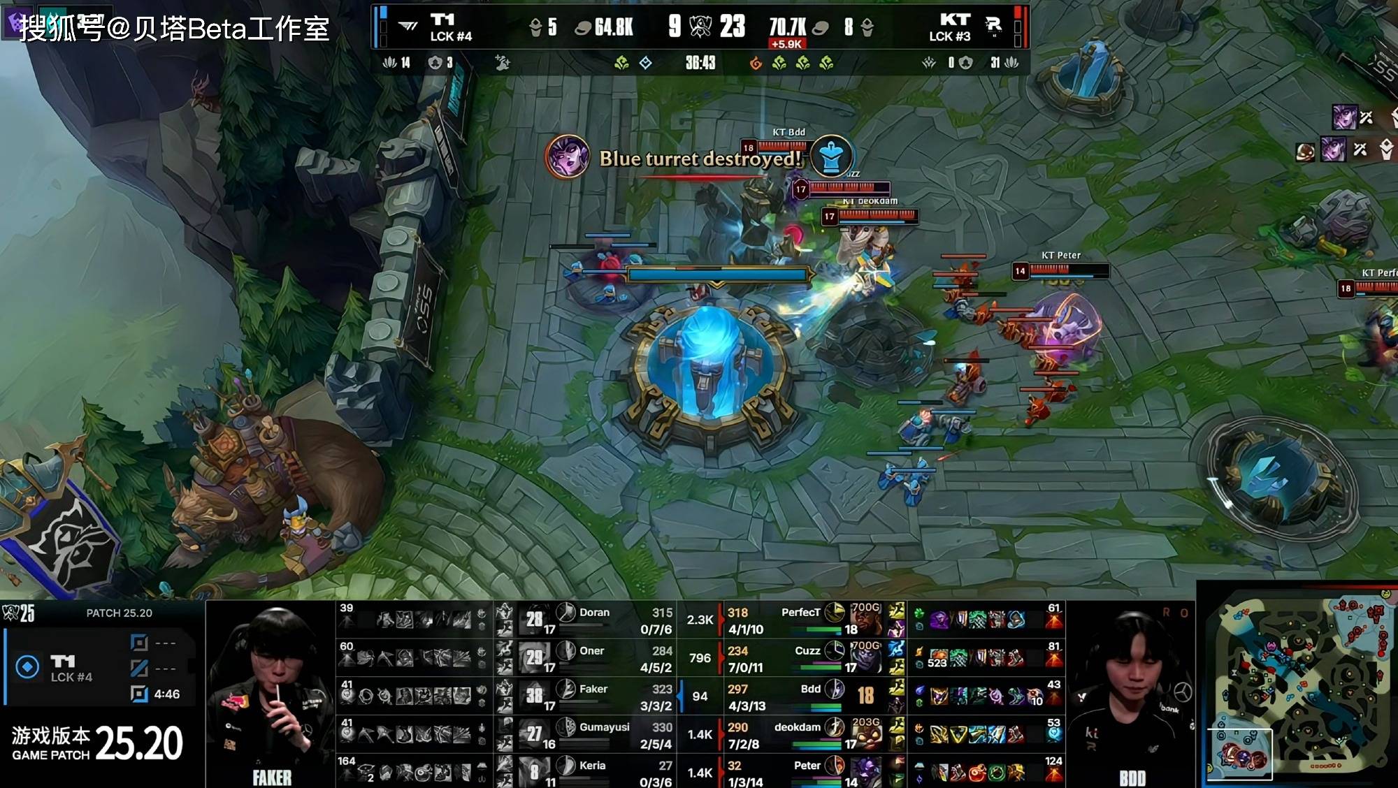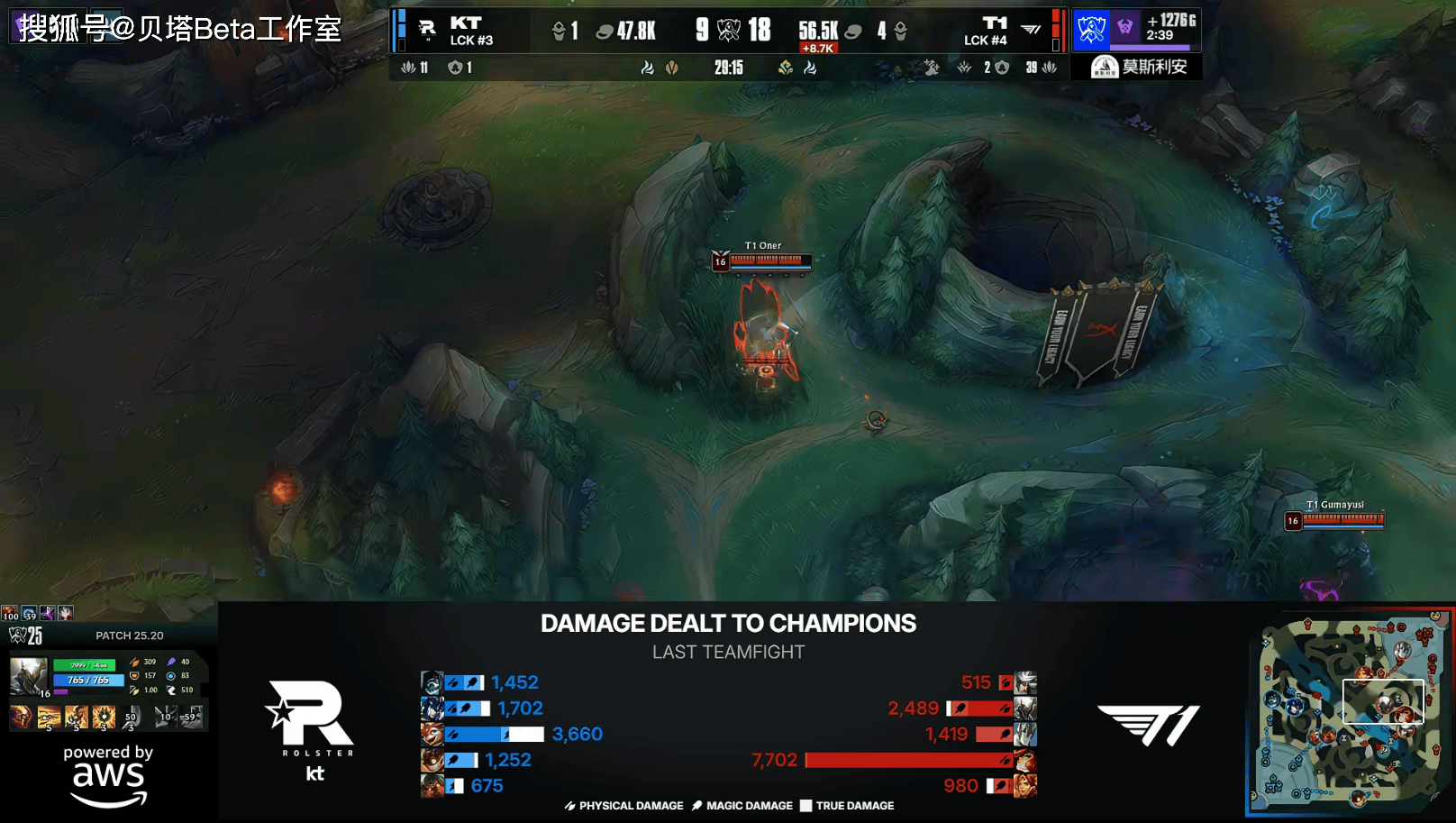 中期中期双方争夺峡谷先锋,Doran安蓓萨直接开到Deokdam艾希,T1打出0换2后拉扯打厄塔汗,KT其他人想要阻止被T1团灭,T1拿下厄塔汗。28分钟双方中路混战,虽然Oner赵信开团率先被秒,但是BDD瑞兹被keria波比锤走,T1打出1换3后,拿下第一条大龙。后期35分钟T1拿下第二条大龙,之后Doran安蓓萨直接开团,Deokdam艾希再次被秒,T1打出0换4后,拿下第二局胜利。首局伤害最高的是Gumayusi韦鲁斯。