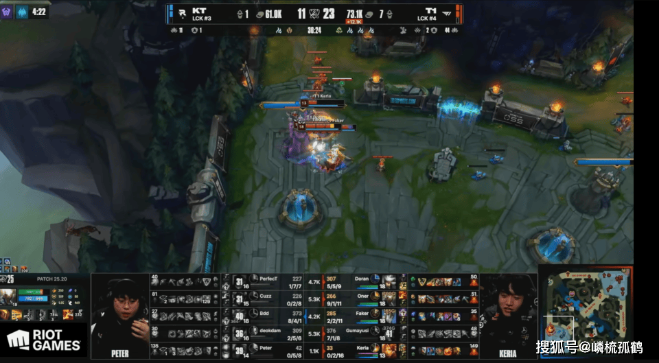 双方的首局比赛就能明显看出,KT的全员状态要比T1更好,KT一度靠着前期的小节奏拿到了3K的优势,并且还拿下了两条小龙,可就在第三条小龙的争夺中,T1成功抓住对手配合失误打赢团战,一举逆转了经济,成功拿下首局的胜利。