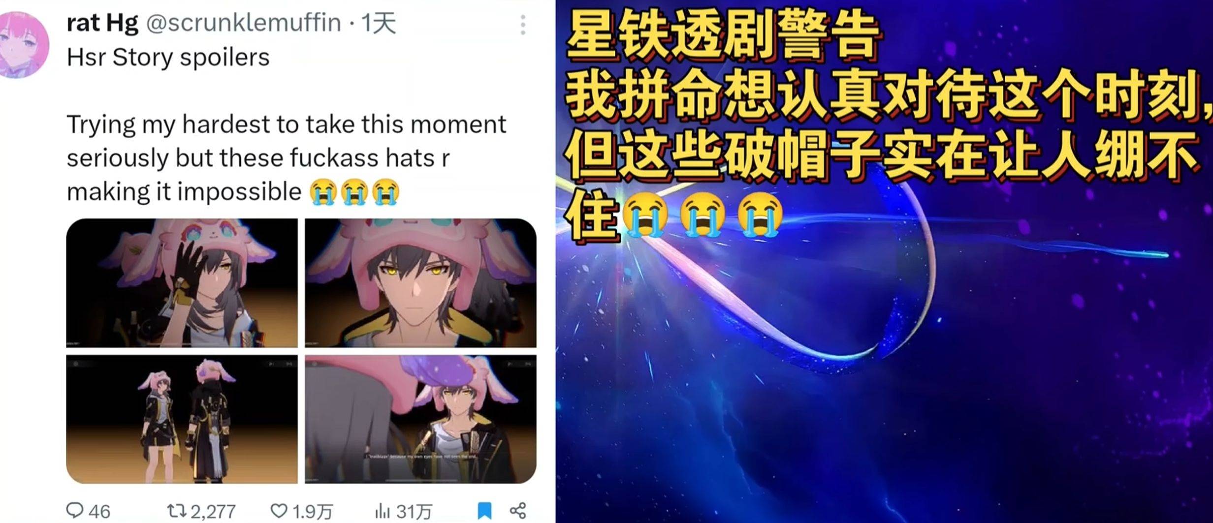 就在玩家正对着屏幕屏息凝神,疯狂脑内复盘两人的身份伏笔时,结果镜头拉近,赫然看见这两位可能关乎命途走向的关键人物,脑袋上都扣着同款迷迷痛帽,严肃感瞬间碎成渣,玩家根本绷不住,纷纷乐出了声。