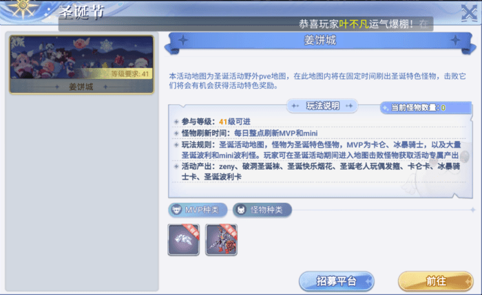 3.玩法规则: 圣诞活动地图,怪物为圣诞特色怪物,MVP为卡仑、冰暴骑士,以及大量圣诞波利和mini波利怪。玩家可在圣诞活动期间进入地图击败怪物获取活动专属产出。