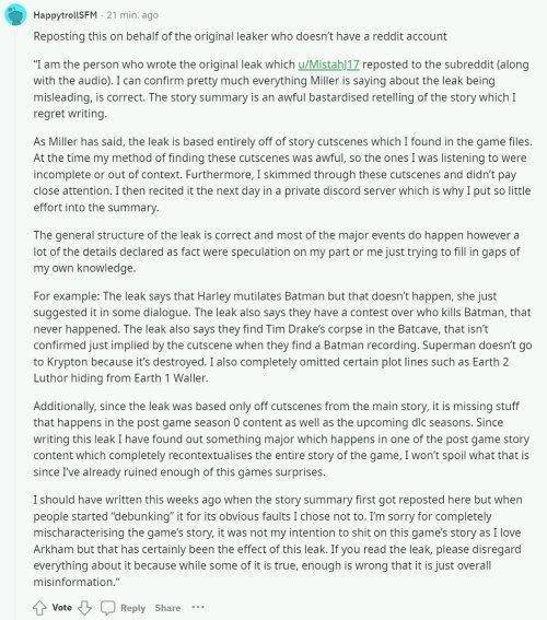 他表示,其编造故事的过程中存在着大量的臆测,略读以及完全的编造,一些情节线甚至被完全省略了。他现在看到了自己的泄露对游戏的破坏并意识到自己行为的不正确性。