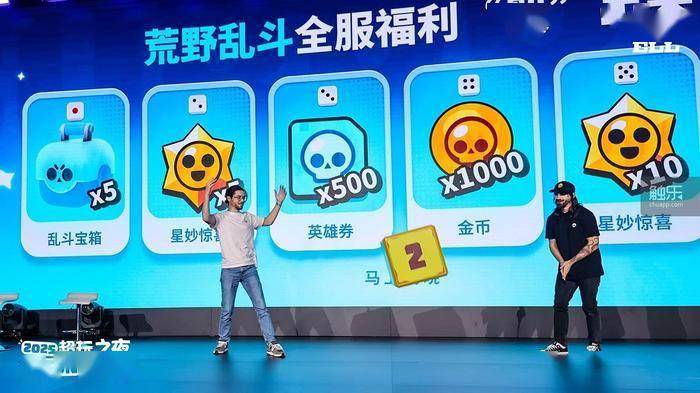 《荒野乱斗》的福利由主创Dani和Marzio亲手掷骰决定。第一次,骰子定格在“3”,现场响起一片鼓励的掌声。Dani与Marzio相视一笑,毫不犹豫地捡起骰子:“One more time!(再来一次!)”第二次、第三次……现场的期待感被彻底拉满。直到第四次,当骰子翻滚后亮出最大的“6”点时,全场瞬间爆发出雷鸣般的欢呼与尖叫,这份“争”取来的顶级福利,让幸福感加倍。
