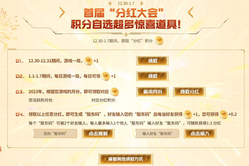 从12月30日到1月7日,CF将迎来史上最独特的盛事——首届“分红大会”!这可不是普通的庆典,而是玩家们将亲身参与其中,成为“股东”,绝对是好礼送不停!