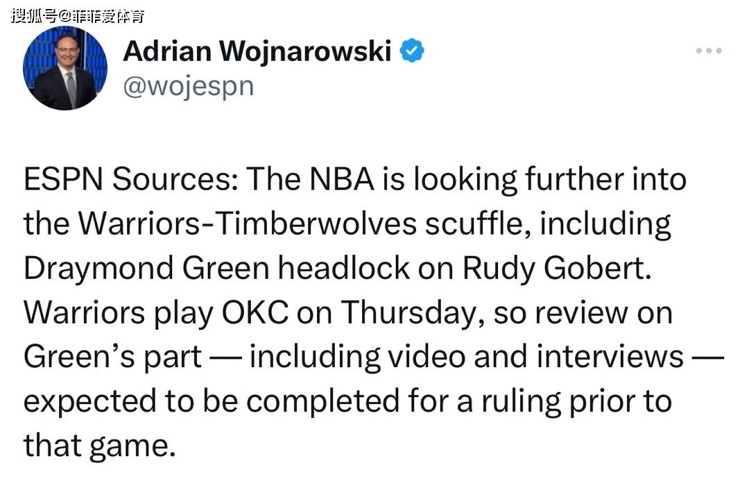 根据Woj最新报道,多位消息人士透露,NBA联盟正在进一步调查勇士对阵森林狼开场所发生的冲突,包括格林锁喉戈贝尔,而对于格林的部分调查预计会在勇士对阵雷霆比赛之前完成。