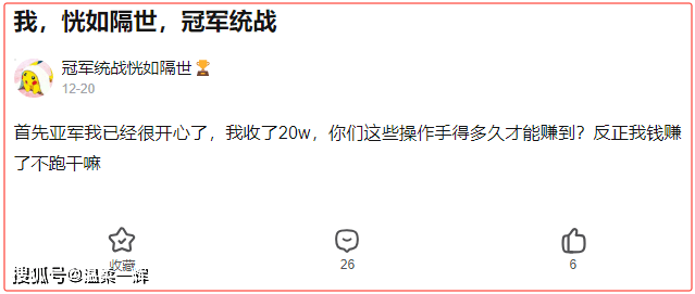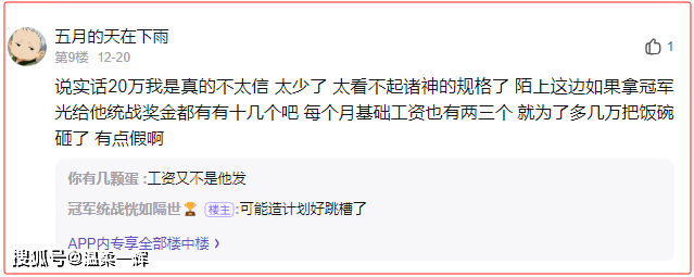 如果此次“诸神之战”夺冠,航格式个人至少能拿到十几万元的奖金,而且之后的工资待遇可能也会提升。在这样的收益下,收对手“区区20万”就故意放水输掉比赛,被玩家们谩骂还可能丢掉工作,怎么想都不值得!
