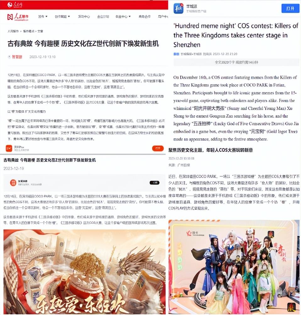 官方玩梗,三国杀文化这次又亮了!2023年12月16日,《三国杀移动版》cos大赛在深圳福田COCO PARK圆满落下帷幕,百梗夜行,神级cos现场出没。本次COS大赛受到广深地区《广州日报》《深圳晚报》《羊城晚报》等颇具影响力的媒体和报道,神荀彧主题曲《落子江山》登上CCTV的舞台。