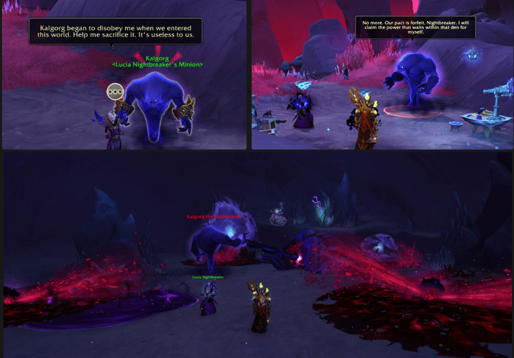 任务线中,玩家将与虚空精灵术士露西亚·夜行者一同踏上征程,帮助她控制邻近区域的虚空能量。由于她的虚空行者卡尔戈格过于桀骜不驯,无法发挥作用,露西亚试图将其献祭,但卡尔戈格却挣脱束缚,逃往附近洞穴。玩家将与露西亚一起,从附近的生物身上汲取能量,挑战卡尔戈格,将其收服。成功之后,露西亚为表彰我们的努力,奖励“黑夜魔萨亚德”(Black Incubus Sayaad)的自定义功能。