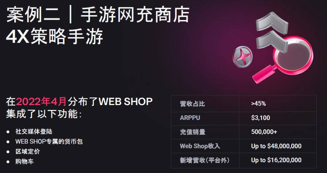 Xsolla 的数据显示,通过对以上三大特性的综合运用,目前在格斗、RPG 以及 4X 游戏都已经有产品将网充商店的交易收入占比提升到 30% 以上。带来的结果则是用户 LTV 提升至少 15%。陈京波表示,网充商店真正的优势在于能够进一步满足各类玩家的不同需求,通过进一步触达更多潜在付费玩家,让游戏产品收入最大化,同时留住玩家。
