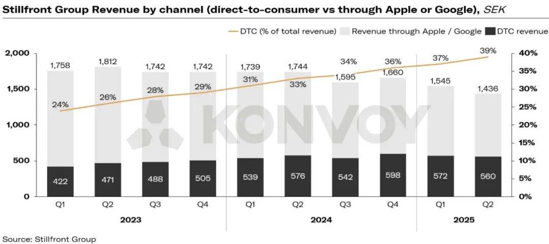 从2023年Q1开始,瑞典头部游戏厂商Stilfront的DTC收入占比也在不断上升,截至2025年Q2已经达到39% | 图片来源:Stillfront