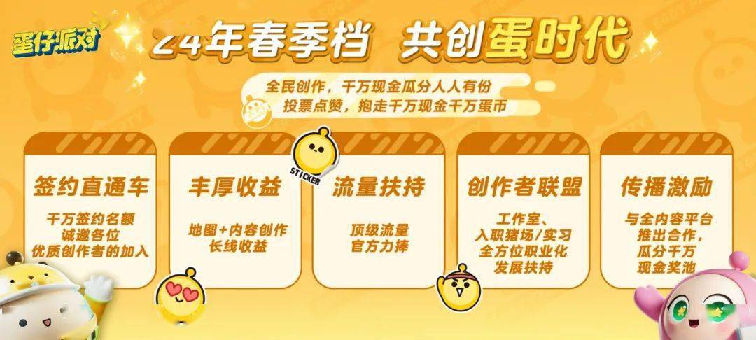 同时,围绕2年5亿的「共创蛋时代」计划,一方面打好多元福利赛事+「官方激励+签约体系」的组合拳,深化创作技能提升与个人价值之间匹配度,另一方面以全民春季主题创作活动为拓展窗口,以单次1500w奖金和千万蛋币的加码力度,包含了「超级巨匠」独享150万元现金大奖,协助优秀创作者组建个人工作室、开辟全新的公益创作赛道等,将个人价值上升到新层级,与每一个创作者、传播者、用户实现真心换真心。