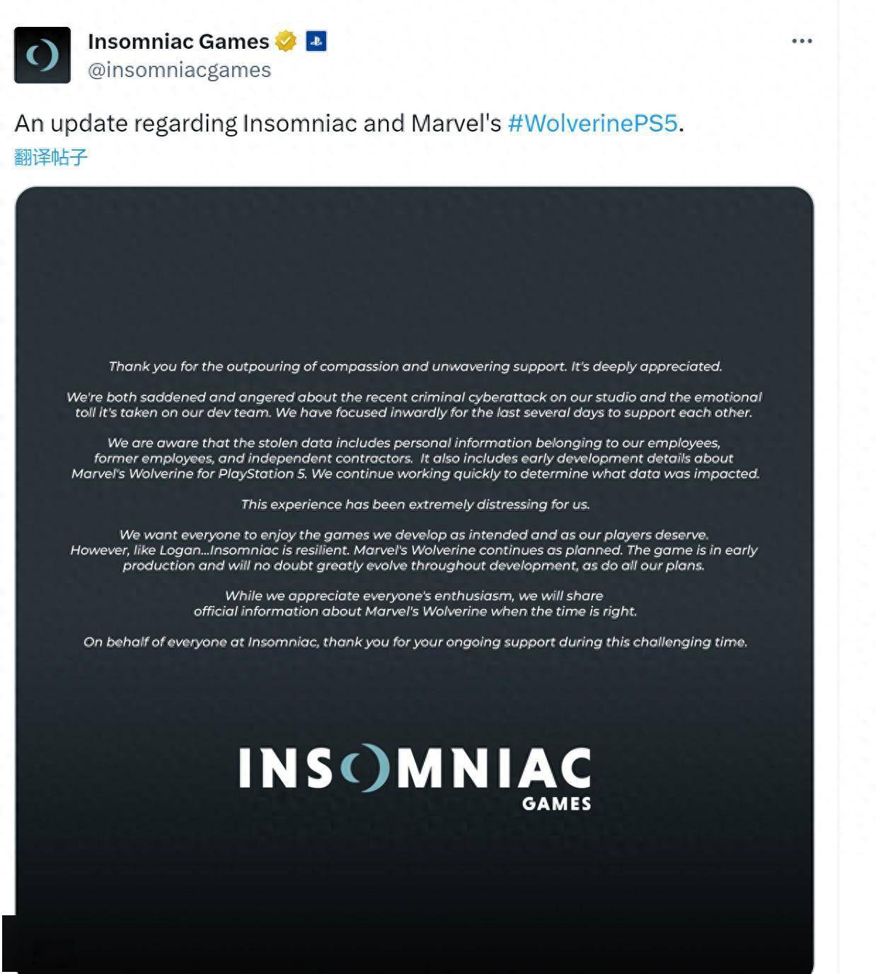 我们知道被盗数据包括我们的员工、前员工和独立承包商的个人信息。它还包括PS5《漫威金刚狼》的早期开发细节。我们正在努力快速确定哪些数据受到了影响。
