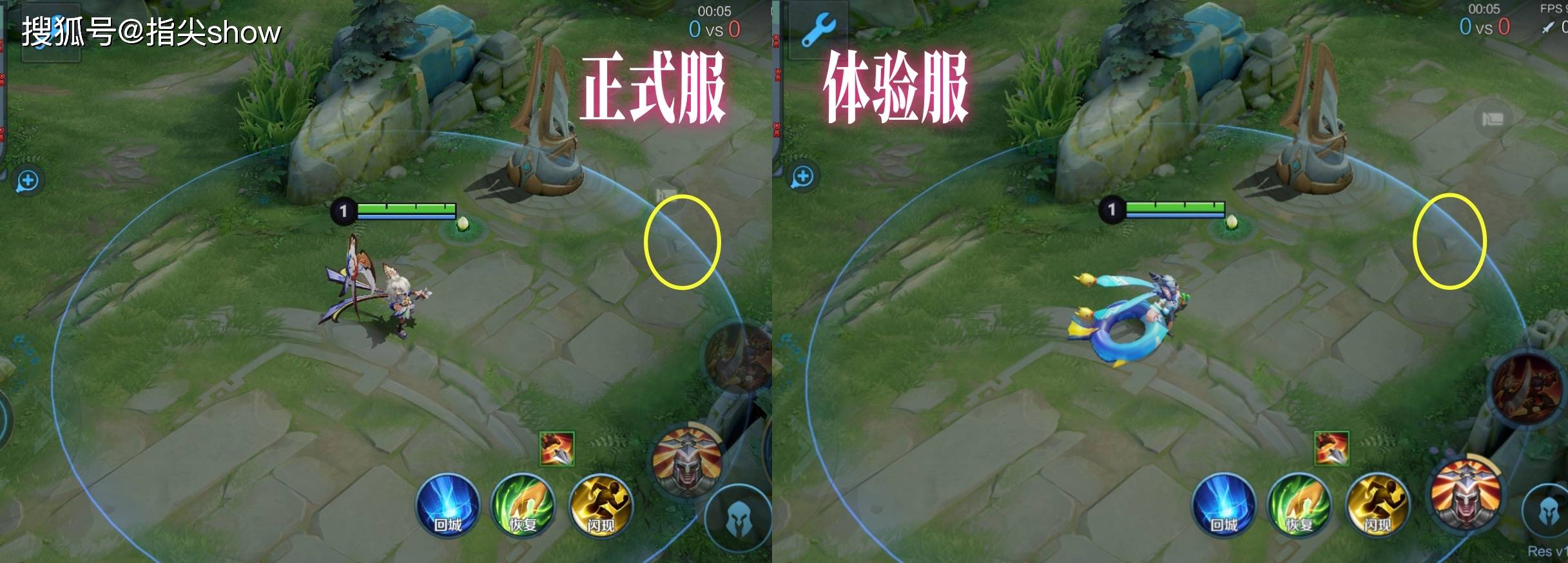 参照物就是地图上这个三角石头,正式服可以看到,三角的尖尖刚好顶在普攻距离的边缘,而体验服拉开的那一点距离就是25码,所以对比之后大家的感受如何?