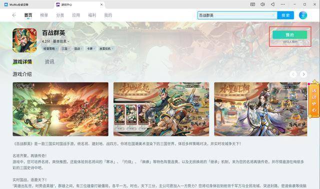 方法一:启动模拟器,进入桌面上的“游戏中心”,在搜索框内搜索“百战群英”,点击预约,待游戏公测开启即可畅玩;