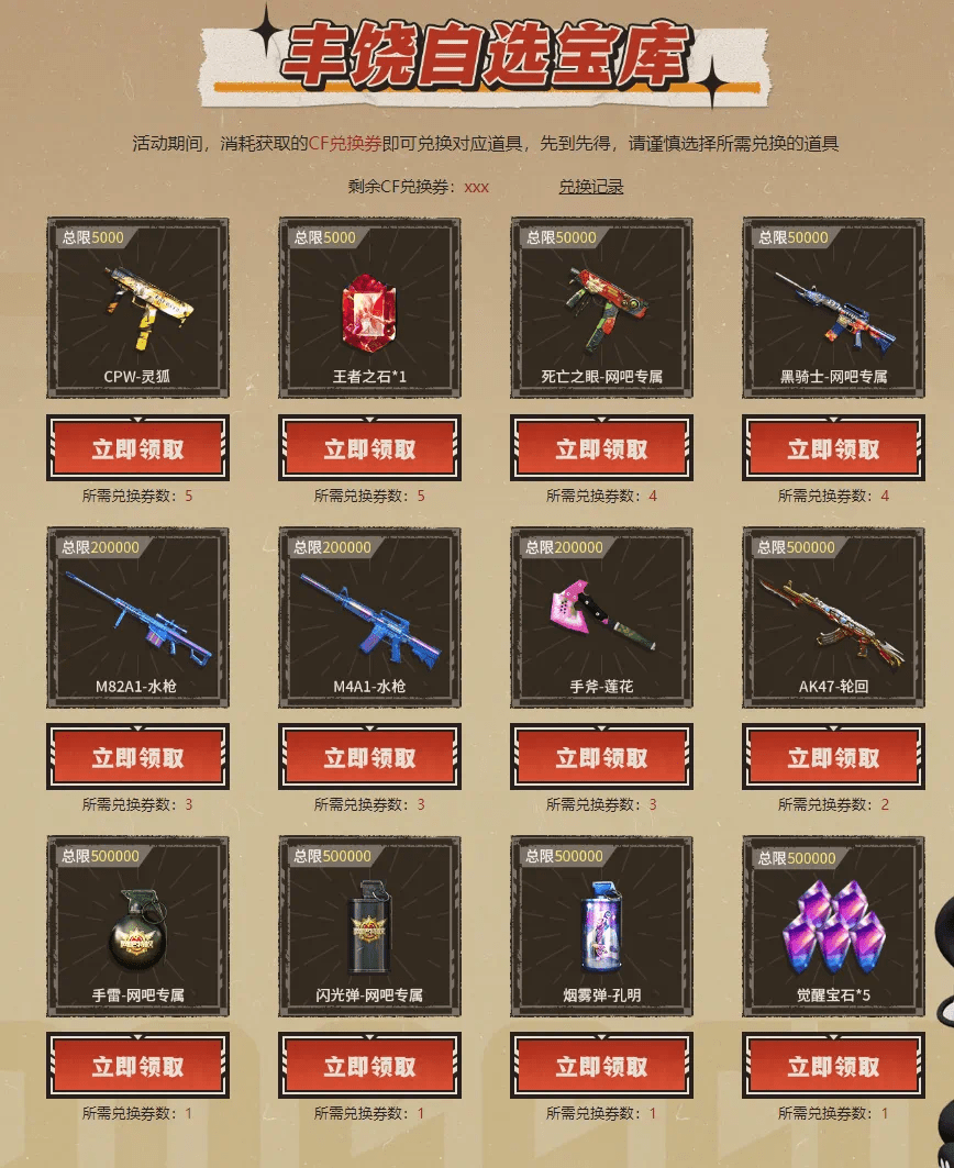 当然,网吧专属的自选宝库也是很丰富的。活动期间,玩家消耗获取的CF兑换券就可以兑换相应的道具了,“CPW-灵狐”、“王者之石”、“黑骑士-网吧专属”等等,都在自选宝库中呢。不过每件道具的数量有限,先到先得,想要的CFer可得早点去。