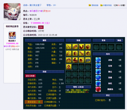 近日,【曲阜孔庙】有位小伙伴在闲逛藏宝阁时,发现了一只百万级别的翻页魔化童子。这只魔童不仅拥有13个技能,还有三大特殊技能净台、善恶、神马,这种配置妥妥的豪门级别。