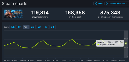 2023年度最佳游戏《博德之门3》首次开启促销活动后,强势称霸Steam销售排行榜。